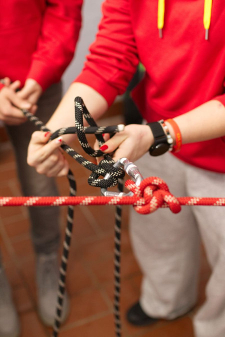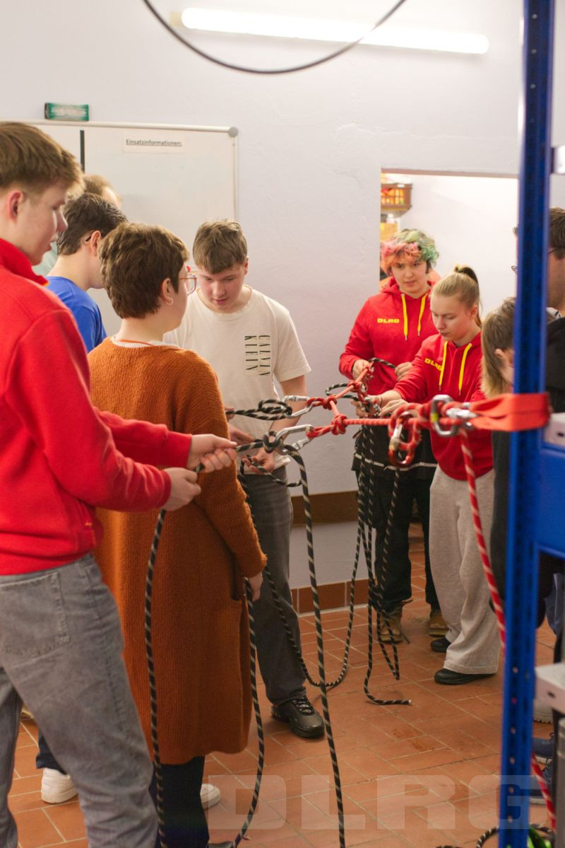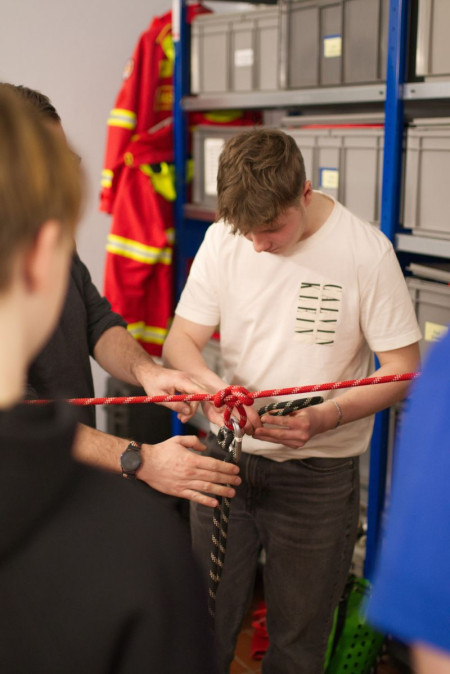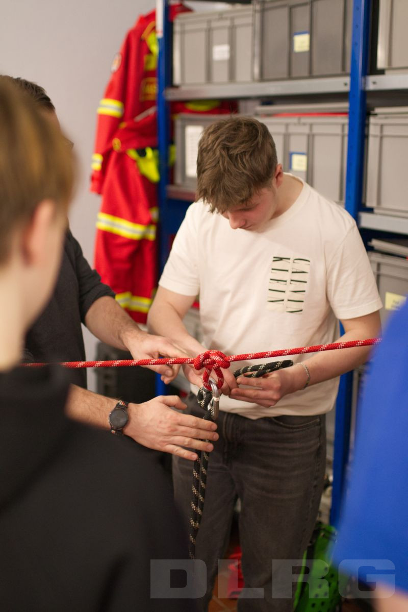 Im zweiten Teil des Abends ging es dann vom Bekannten ins Neue über und den Teilnehmenden wurde ein Bereich der Strömungsrettung vorgestellt. Während ihnen zunächst eine kurze Einführung in die zum Teil sehr unterschiedlichen Knoten gegeben wurde, konnten sie sich danach in der Garage an einer komplexeren Vorrichtung zur Fixierung von Lasten versuchen.