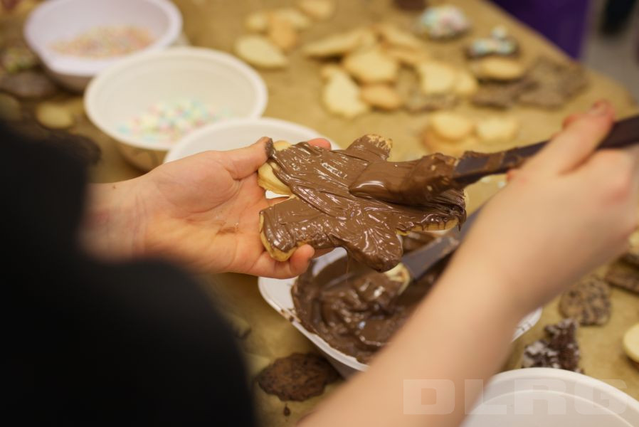 Nach dem Backen ging es an die kreative Feinarbeit: An den Tischen der Teilnehmerinnen und Teilnehmer wurden die Kekse mit Zuckerguss, Schokoladenglasur, Schoko- und bunten Streuseln sowie Marshmallows verziert. So entstand viel liebevoll dekoriertes Mürbegebäck.